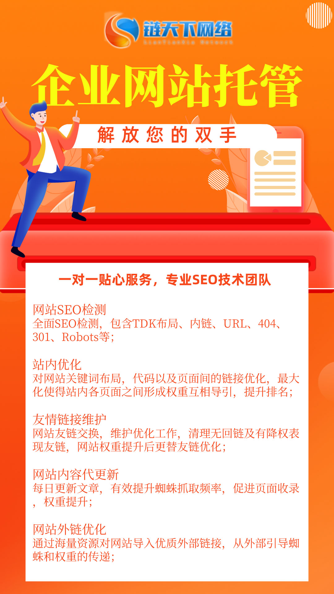 無(wú)論您是需要定期更新網(wǎng)站內(nèi)容,還是需要針對(duì)某個(gè)具體活動(dòng)或事件進(jìn)行更新,鏈天下都愿意成為您的合作伙伴。請(qǐng)?jiān)L問(wèn)我們的官方網(wǎng)站www.sztbaoli.com,了解更多關(guān)于我們的服務(wù)和合作方式。我們期待與您的合作,共同打造一個(gè)成功的網(wǎng)站。