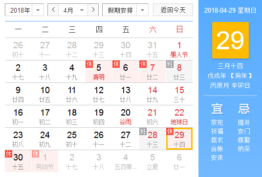 4月29日(星期天)至5月1日(勞動節,星期二)放假調休,共3天。